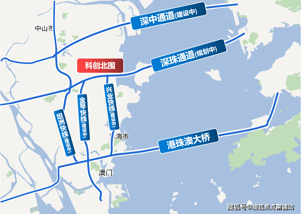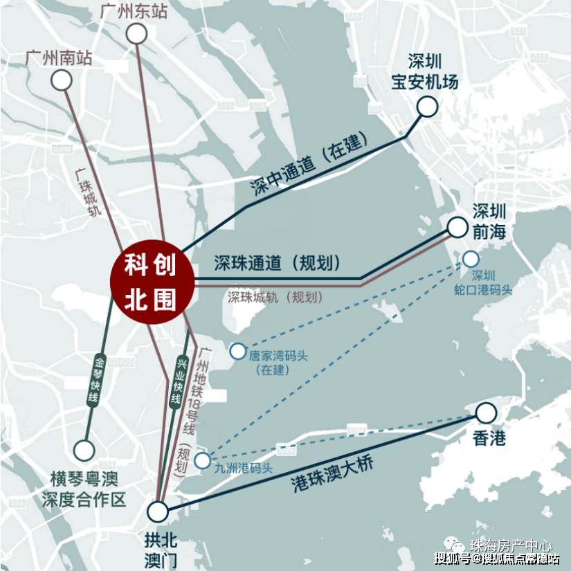 科创北围自身即坐拥城轨珠海北站、广州地铁18号线年通车),近揽金琴快线、兴业快线纽带,又有广澳高速、京港澳高速盘绕,科创北围可经过高速公路网络,快速衔接全国各地。