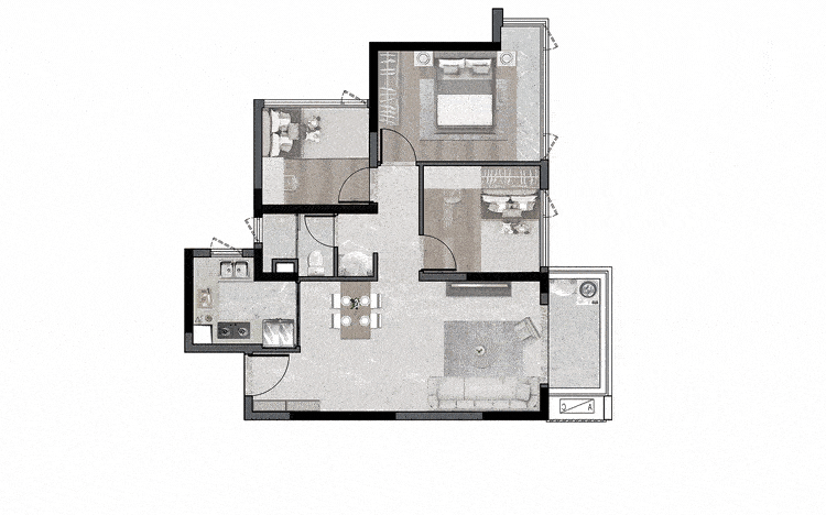 全明三房规划,三别离干湿分区卫生间...在功用布局中,最大化完成空间运用率,满意根底寓居需求。为了最大化地运用一线沿海资源,规划师经过阳台-客厅-卧室观景相连,完成三面瞰海。