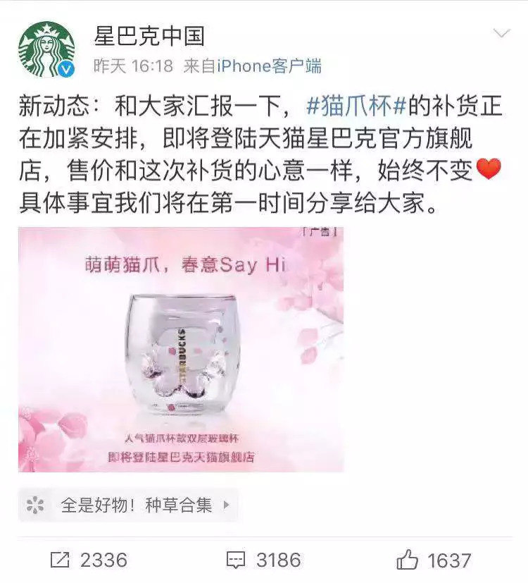 看到自家出的“猫爪杯”被如此疯抢,昨日(2月26日)星巴克中国官方称,为满足更多星粉对这一系列新品的厚爱,它们正在星巴克中国天猫旗舰店积极备货并尽快在线上平台推出。